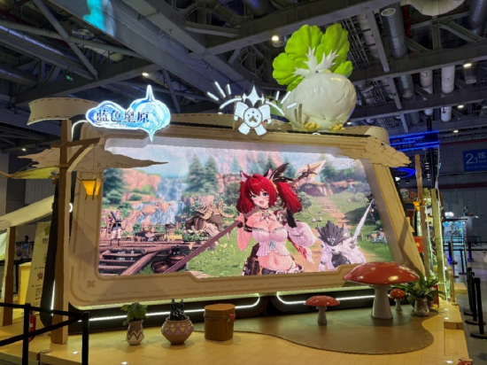 本次《蓝色星原:旅谣》的展台在2.1H展馆的2A22,2A22是最靠近展馆前方入口的展台之一。展台顶的“菜鸡”格外引人注目,如果玩家不小心迷路了,从远处也能通过“菜鸡”找到游戏展台的位置。展台侧面类似舞台剧风格,别有风味,就算是此前没关注过《蓝色星原:旅谣》的玩家,也能一眼感受到游戏的世界观概念及视觉风格,以及角色和奇波的魅力所在。