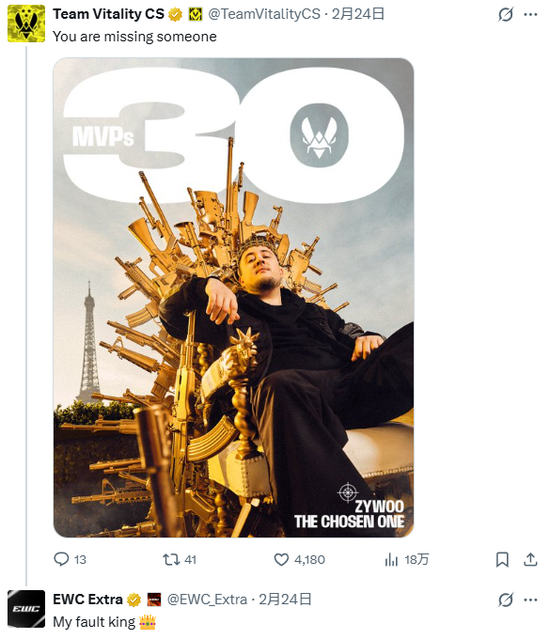 EWC征集电竞总统山第四人 s1mple已上榜 2026-02-25 12:29 新浪电竞 0 近日EWC沙特电竞世界杯主办方在X上发布了电竞总统山的动态,目前来自LOL的Faker、CS的s1mple以及堡垒之夜的peterbut。 Vitality的CS官推在下方回复:你们忘了某个人 EWC回复:我们的错。