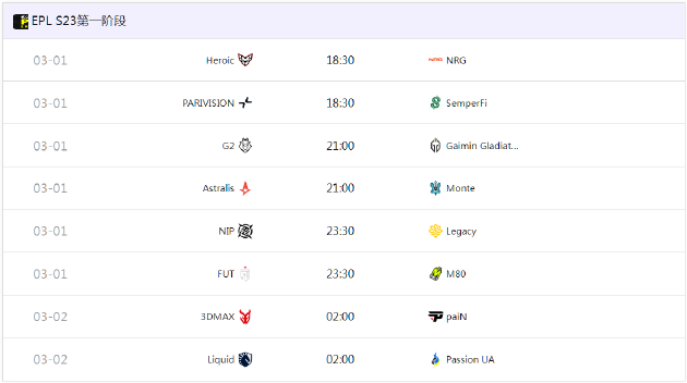 ESL今日公布了EPL S23第一阶段的揭幕战对阵。该阶段比赛将于3月1日至5日在线上进行,采用瑞士轮赛制。