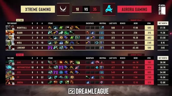 35分钟,冥界亚龙再次带盾,3分钟后想要威胁XG高地,XG主动出击,凯吃完技能后换掉亚巴顿,但是XG后继无力,冥界亚龙复活后配合买活的潮汐猎人和小小又击杀XG两人,XG多人阵亡只能看对手拆掉中上两路。XG众人复活后主动出击,凯在野区倒下没有买活,XG被Aurora一波基地。