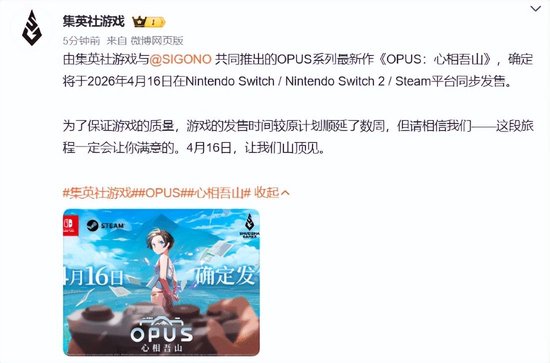 由独立游戏团队SIGONO开发、集英社游戏发行的《OPUS:心相吾山》,于今日播出的任天堂官方直播节目“Indie World”中亮相,并公布最新开发进展。随后官方发布公告确认:游戏开发已全部完成,确定将于 2026 年 4 月 16 日 在 Nintendo Switch / Nintendo Switch 2 / Steam 平台同步发售。