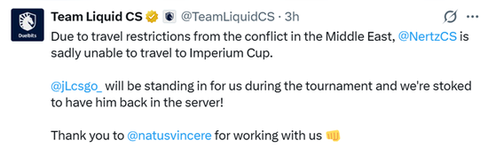 “由于中东冲突导致的出行限制,NertZ遗憾无法参加罗马帝国之声杯。赛事期间jL将代表我们出战,我们非常高兴能再次在游戏中见到他的身影。感谢Natus Vincere的协作配合。”