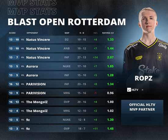 在BLAST鹿特丹公开赛2026期间,ropz一共打了十一张地图,平均拿到1.32 Rating。ropz在小组赛表现平平,对阵The MongolZ和PARIVISION的两场比赛中数据甚至出现低于1.0的情况。但他调整的非常及时,在淘汰赛开启“超神”模式。半决赛对阵Aurora的比赛中他豪取队内第二的1.57 Rating,在总决赛对阵NAVI的比赛中图一的Rating更是高达2.07,最终取得了全场最高的1.59 Rating,成为这场比赛队伍表现最出色的选手。