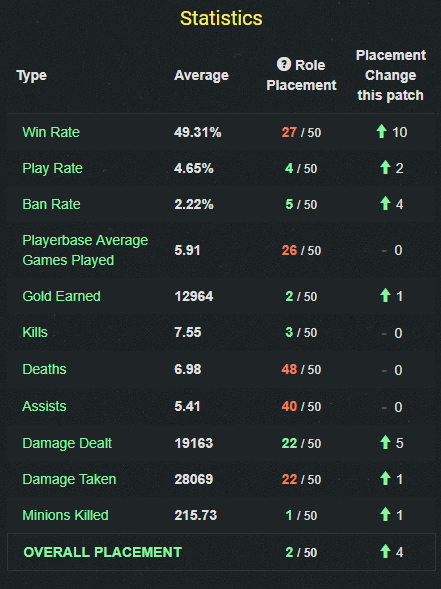 刀妹在重做之后,相比之前的出场率大有提升,玩家在玩法上也进行了很多创新。现在刀妹不仅可以作为上单,更是多次出现在中单位置上。灵活且具有高伤害的她,成为很多法师的噩梦。我们从上单的数据中可以看出,胜率49.31%,出场率4.65%,禁用率2.22%,可以看出刀妹已经成为很多玩家的上分英雄,比赛上选手也会经常选择刀妹出场,可见最近刀妹还是拥有不错的强度。