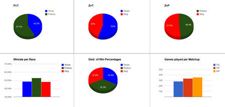 至于各种族的胜率,无论是在国际赛场还是韩国赛场,神族的胜率均稍高于另两个种族。不过,总体来看三个种族的胜利场次都相差不大,比例如下:神族国际版35.3%、韩国版35.3%;虫族国际版32.2%、韩国版32.1%;人族国际版32.4%、韩国版32.6%。