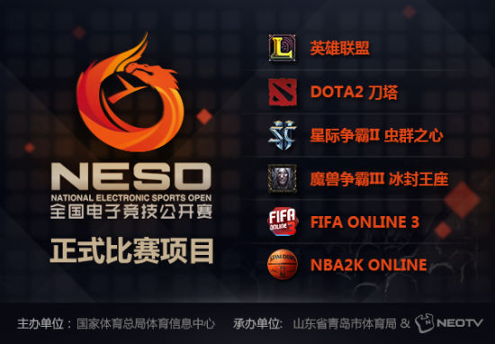 由中国电子竞技赛事顶尖运营商及直播方NEOTV携手国家体育总局体育信息中心,即将在今年为广大电子竞技爱好者带来全国电子竞技公开赛(National Electronic Sports Open简称为:NESO)。这项对于电子竞技行业来说的重磅赛事,不仅是我国电子竞技体育发展战略的重要组成部分,同时也是宣扬电子竞技体育文化的重要组成部分,将为在全国范围内推动绿色游戏、阳光电子竞技在年轻人群中的影响,同时也为树立电子竞技行业的标准而努力。