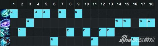 技能加点主Q副E,3级的时候各点一级,对线亚索、劫、妖姬这类灵活的刺客时,Q技能不容易命中可以考虑多点前期几级E技能。