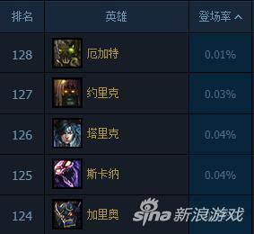 登场率:依然是厄加特、约里克和塔里克,宝石骑士塔里克增加了0.01%的出场率反超了约里克成为倒数第三。与宝石骑士相同出场率的还有斯卡纳和加里奥,他们都曾经是热门,但是如今崛起基本上无望。其中蝎子已经经历过一次重做,但是在削弱之后依然沦为冷门英雄,用一句话概括真是宝宝心里苦啊!