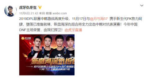 中韩对抗历来是DNF各大赛事最大看点之一,在去年的DPL联赛韩国选手金太焕在中国主场夺得个人冠军,一度让国内选手有些汗颜。今年DPL联赛将再度上演中韩经典对决,作为初代“抗韩”勇士的仇冬生和月与海也是第一时间表达了捍卫中国DNF主场荣耀的决心。