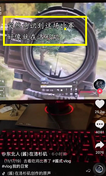 我一南方人也经常看他视频,很欢乐。PGC半决赛在洛杉矶举行,一开始东北酱是在网上看直播,看到第二场比赛酱总突然意识到比赛是在洛杉矶举行后,突然起意决定去离他54车程的现场观赛,酱总说走就走,晚饭也没吃决定疯狂一把!