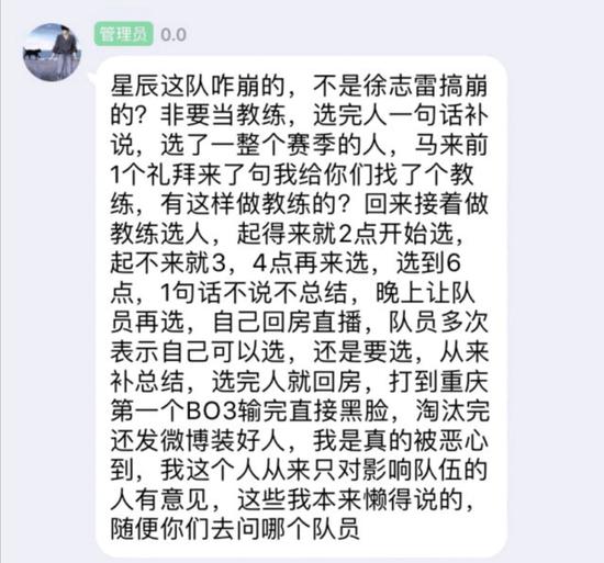 不过Sylar显然有非常大的不满,并非晓菲说的这么轻松。他在水友群里言辞激烈,矛头直接指向B神徐志雷,说徐志雷言而无信。