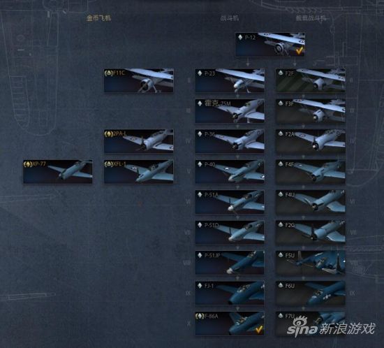 相比其他国家科技树,美系机种较多,作为二战史上最强的战机P-51在其科技树中等级仅为6级,而战后飞机截至弯刀,可以说《战机世界》的主要取材时间在1959年以前。