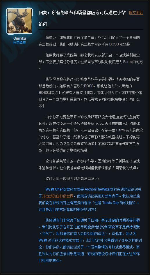 其实这个事情已经不是第一次提到台面上,早前玩家便一直在反映现有小站系统不科学,但是当时的暗黑3总监Jay Wilson(杰伦)的说法是他们希望给玩家在 Farm 的同时提供一种自己处于正在发生的故事之中的感觉,尽管如此,这种单一线性的进度方式依然引起了许多玩家的不满。