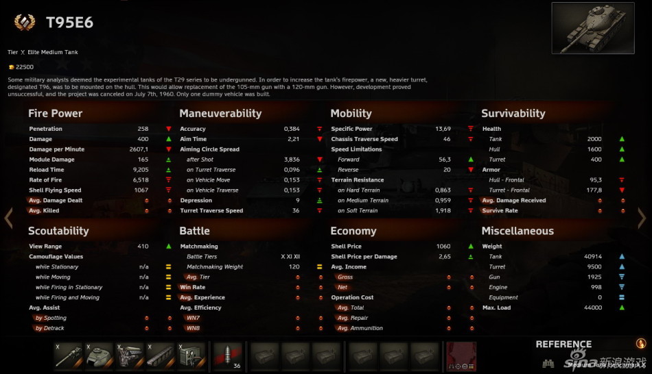 新浪游戏讯 1月27日消息,近日《坦克世界》8.11超测服更新了新金币车的部分数据,值得注意的是新10级奖励车T95E6数据,22500金币的价格似乎比现在国服所贩售的同类10级金币车要便宜一半。