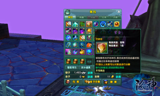 绽放紫色光芒的神石,是合成神兵的必备材料,可通过大转盘,野外BOSS,等途径获得的它如果玩家迫不及待的想拥有神兵那就可以花身上的绑定金券去购买吧!