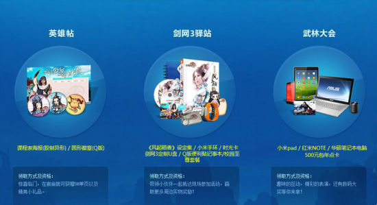 活动图解届时,每所活动高校都将有众多《剑网3》主题的互动小游戏等待侠士的参与,同时送出《剑网3》周边和豪华数码大奖!其中每一名老玩家带一名新玩家过来现场参加活动即可获得一次抽奖资格;每一名新玩家现场注册体验即可活动一次抽奖资格;每一名参与活动的老玩家及成功注册体验的新玩家均可获得神秘门票……此外,所有校内老玩家还可参与轻功大赛,在指定路线所花时间最短的玩家获取参加“武林大会”晚会总决赛资格。