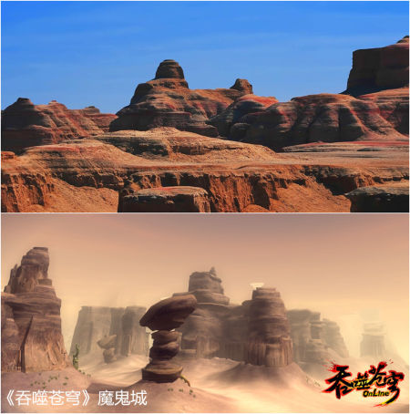 在《吞噬苍穹》的魔鬼城中,你可以看到那些令人眼花缭乱的陡壁悬崖,酷似城堡、殿堂、佛塔、碑、禽兽形态各异的景观等,通过千年风沙的洗礼,这里已经变成断壁残垣。每当大风到来,黄沙遮天时,凄厉呼啸的大风在魔鬼城里激荡回旋,如同鬼哭狼嚎,令人不禁毛骨悚然。