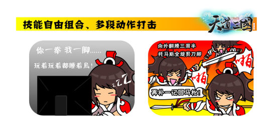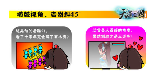 《天道三国》主题漫画《天道三国》选择2.5D画面采用横版视角呈现,很大程度上是为了兼顾新老游戏玩家而专门设计:传统回合玩家中“3D眩晕症”族群不在少数,因而只能选择“固定视角”2D游戏;主流游戏画面质量升级迅速,以学生为主的新生代玩家经过洗礼,对游戏画面质量有更高要求!