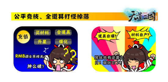 《天道三国》主题漫画据了解,在当前“免费网游/道具消费”的游戏主流经济模式下,除部分数值设定较为合理的经典大作外,多数免费网游产品都存在较为明显的平衡性问题。普遍表现在:RMB战士都能够通过大额投入持续消费以堆叠数值,从而实现对草根玩家的战力碾压。