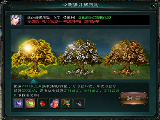 在此次《新大话3》免费版满月庆活动中,诸位玩家的所有充值消费,都将获得巨额的返现奖励和道具奖励:10月17日起至11月30日,玩家可选择金、银、铜三种摇钱树中的任意一棵进行种植,每棵摇钱树可提供12次奖励机会,掉落大量军饷,还有超级魂石、高级魂石、高级武侯图等诸多奖励!谁说天上不会掉馅饼,机不可失、失不再来!