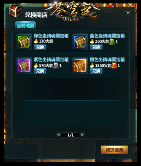 苍穹变坐骑装备的兑换是相当的简单易懂,只要玩家获得足量的火能和相应数量的火能卡,就可以从乌坦城-傅少(190,135)处兑换坐骑魂器宝箱。火能卡和火能可以通过“火能战场”和“精彩活动”中获得,新的坐骑系统就由此拉开序幕喽!