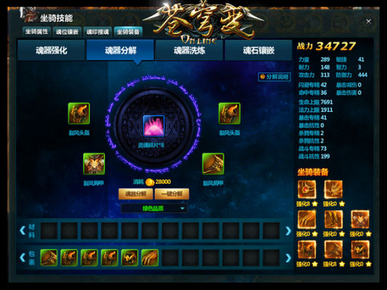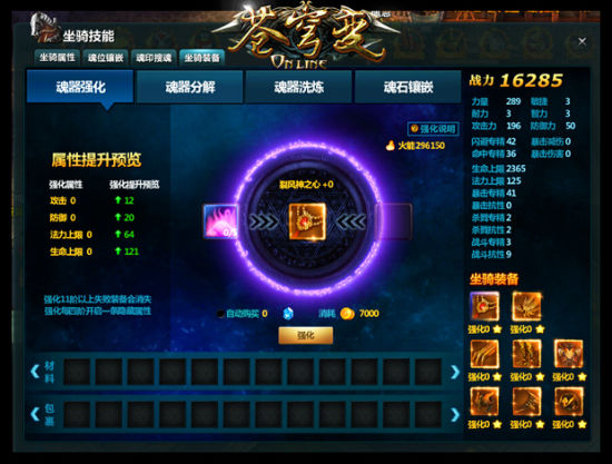 坐骑魂器是可以进行强化的,强化的时候是需要消耗一种叫做“灵魂碎片”的道具,玩家可以通过晶钻购买或是分解魂器都可以获得。强化的几率是很高,小编一套+8基本上是分分钟轻松上线,愉快的节奏啊!