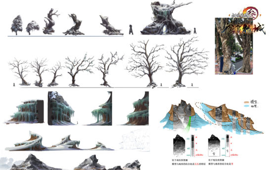 实地采风《剑网3》“苍雪龙城”资料片筹备时长超过一年半。为了真实还原太原和雁门关一带的场景环境,制作团队在2013年冬季就千万山西太原进行实地采风,记录了数千张珍贵影像。随后经过原画师的解构和还原,创作出数百张融入了唐朝时代背景,宏观至整个场景的构图,细微至树木纹理的概念原画。