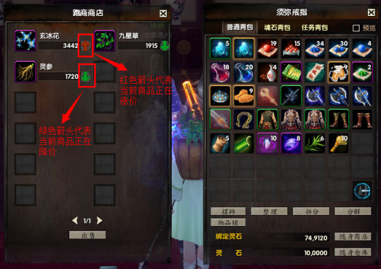 在商人店铺里,标红色箭头代表商品正在涨价,标绿色箭头代表商品正在降价,仙友们遇红色箭头,可将手中相应商品进行抛售,遇绿色箭头,可将店铺降价商品买入。通过这样低买入高抛售的方式,不断在各地商人之间赚取差价,从而获取高额利润。
