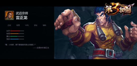 斜长的眉毛,小小的眼睛,下垂的嘴巴,拽酷的表情,乍一看,还以为是天王周杰伦呢。其实他不是周杰伦,也不是李小龙,他是雷正龙。传说,他的速度像雷电一样迅猛;他的身法比部落丛林里的兔子还要敏捷。他在团队中也起着非常重要的作用,危急时刻拿取人头迅速回复生命值是取胜的关键所在。
