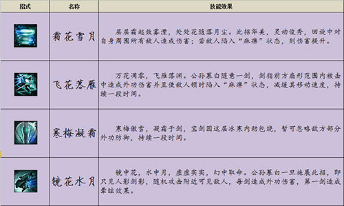 寒梅凝霜:寒梅傲雪,凝霜于剑,宝剑因这层冰寒内劲包绕,暂可忽略敌方部分外功防御,持续一段时间。