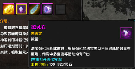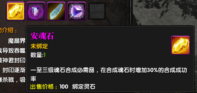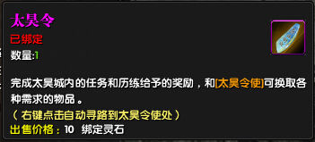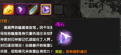 1.产出:安魂石、蕴灵石、太昊令、魂石等极品道具,能大量提升合成成功率,对强化法宝有很大作用。其中太昊令更能兑换【四合踏雪羊坐骑】、40级或50级的【玄色装备】。