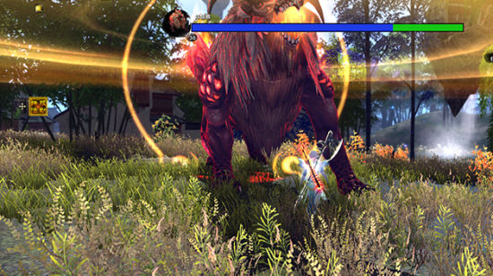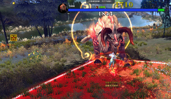 炎晶兽锥形范围技能【重点提示】炎晶兽有一个超大范围的群攻技能,伤害范围以其自身为圆心,往外扩散。它在施放此技能前,会有一个低头的施法前摇动作,此时想要跳开躲避是不现实的,最好是按[T]键或双击空格键飞起来,飞到高于炎晶兽身体的高空才能躲开。