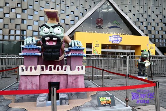 在TGC展会入场口,一个三米见方的“秦尸皇”虎视眈眈,加上严阵以待的兵马俑僵尸阵容,让到场观众如同亲身踏足游戏新关卡“秦始皇陵”。远远望去,不可一世的“秦尸皇”与他的嫡系部队形成了一道极佳的风景线。值得一提的是,玩家可以通过扫描兵马俑身上隐藏的二维码,并通过手机摄像头“捕捉”隐藏在TGC各处的更多隐形僵尸。