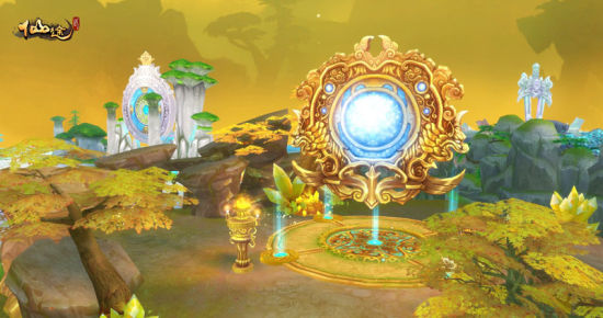 整体呈现出一种金光灿烂的视觉效果,随处可见的金色石晶凸起,带着一种粗粝的奔放浪漫。高悬的铜镜是中国古典文化之中常见的物品,这让画面在玄幻绚丽之时,又多了几分现实的真实色彩,让玩家更有亲切感。