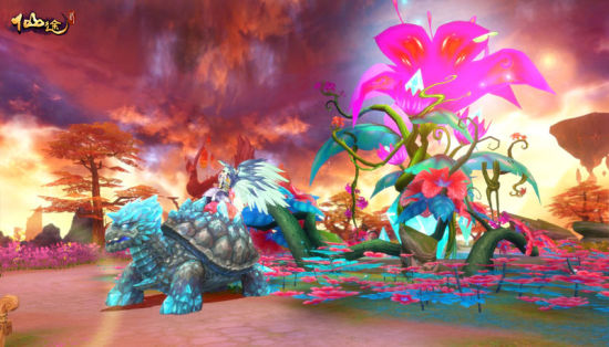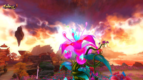 火烧云席卷霞光四溢的天空,高大奇特的藤蔓花朵,独特的火山地貌……交织成一片唯美玄幻的景象。男女仙士可以一同站在此处,看着梦幻奇景,感受微风习习。