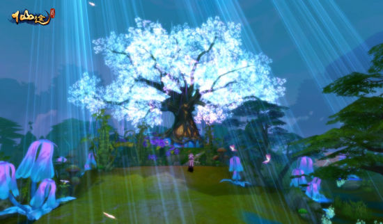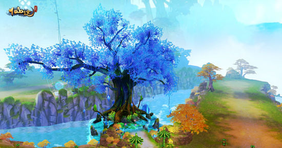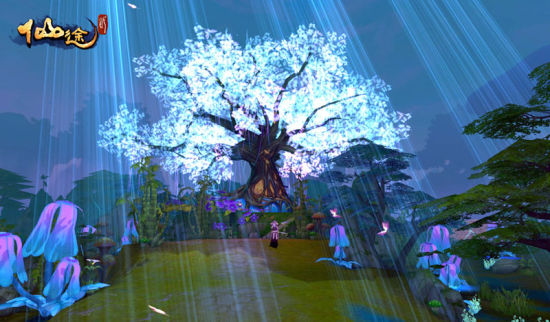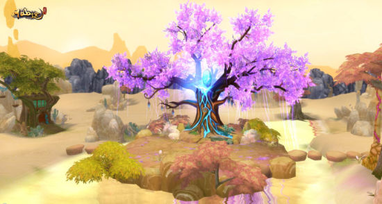 如同是沙漠中的绿洲,细腻的漫漫黄沙之中,有一湾清水,还有一棵通体绽放紫色光华的高大神树。