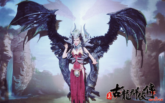在《真古龙》的发布会现场,到处洋溢着古龙风情。会场中的互动要素非常多,玩家可以与游戏中经典的场景以及coser合影。在一进门的墙上,一墙温情满满的照片格外令人流连,其中包括coser和超跑团的美照,此处允许媒体认领与自己相关的照片,真是贴心。印象最深的互动环节是挂在会场入口对面的巨型翅膀。这对翅膀是游戏中青青魔化后的翅膀,翅展有近4米长。到场嘉宾可以站在前面与之合影,亲自体验一把魔化的感觉。有意思的是,这对魔翅肋下还附带一双鬼爪,而游戏中这对鬼爪是青青的护胸。