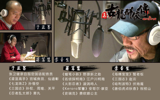 《真古龙》中登场的所有英雄都有专属配音,其中不乏来自中港台地区的大腕级声优。比如红遍大江南北的“蜡笔小新”的配音员蒋笃慧,其辨识度极高声音将带给玩家惊喜。台版《哈利波特》中为伏地魔配音的李香生,其沙哑诡异的音色被奉为一切反派boss的御用声优。张卫健指定国语配音于正昌,曾在《灌篮高手》中分饰宫城和仙道两角,音色变换自如,堪称配音界高手中的高高手。此外,还有在配音界被公认为宗师级的配音员也会为游戏献声,比如给圆月弯刀丁鹏配音的马西屏,其标志性的狂笑尽显角色的张狂。在游戏中为神农氏配音的是元老级的盛竹如,一出声就能将玩家带回到八九十年代港台武侠片的感觉中。