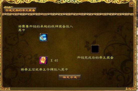 2、将需要升级的205装备放入上方凹槽,将对应部分的“帝王令牌”,或一定数量的“帝王石”,放入下方凹槽,然后点击“装备合成”。即可完成装备升级。