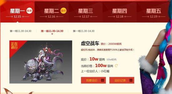 此次竞拍活动于12月17日正式开启,共持续5天至12月23日结束。在此期间,每天三个时段系统都会放出不同的珍稀道具进行拍卖。机会难得,各位玩家请千万不要错过噢!