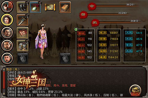 天下武功,唯快不破!在战场上,抢得先机就能够掌握绝对的主动权。如果问,在《女神三国》中,速度最快的将是谁,那么回答你的不是刘备,也不是曹操,而是文昭甄皇后!别看她是一介女流之辈,只要学习了技能“风水涣”,马上脱胎换骨,成为绝代女强人!虽然伤害比普通武技武将差一些,但是自带特技点满,天生就比别人多那么一些速度,可谓是除了暗金女神“左慈”之外,速度第一人。并且甄宓极易获得,只需要进行投资,不但能够在一个月后拥有甄宓,还会有共双倍的投资元宝返还!