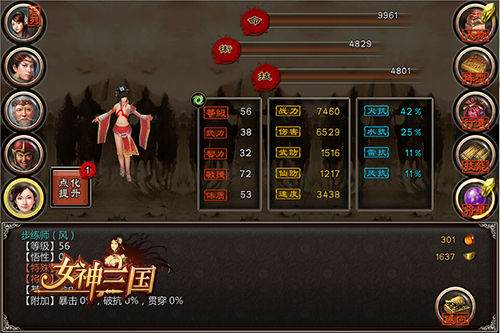 步练师在孙权众夫人之中最受宠爱,性不妒忌,多所推进。在《女神三国》中,她同样非常受广大玩家的喜爱,先不说其作为银像投资的高回报,单单她的技能凤乎舞兮的混乱效果,都能给玩家带来非常大的作用,配合主角仙术八门金锁的眩晕效果,一旦命中即能够100%的进行混乱,非常好用。因此有玩家直接将步练师升金,也有的把步练师的技能抽出来搭配阴风锁魂的虚弱效果来使用,过图打怪,谁用谁知道!