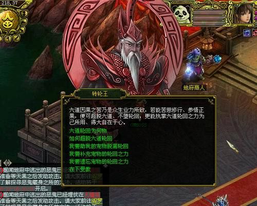当玩家集齐10颗鬼灵珠和500点功德值,宠物与主人亲密值≥10000,可前去地府转轮王(215, 39),选择宠物进行超脱六道轮回。