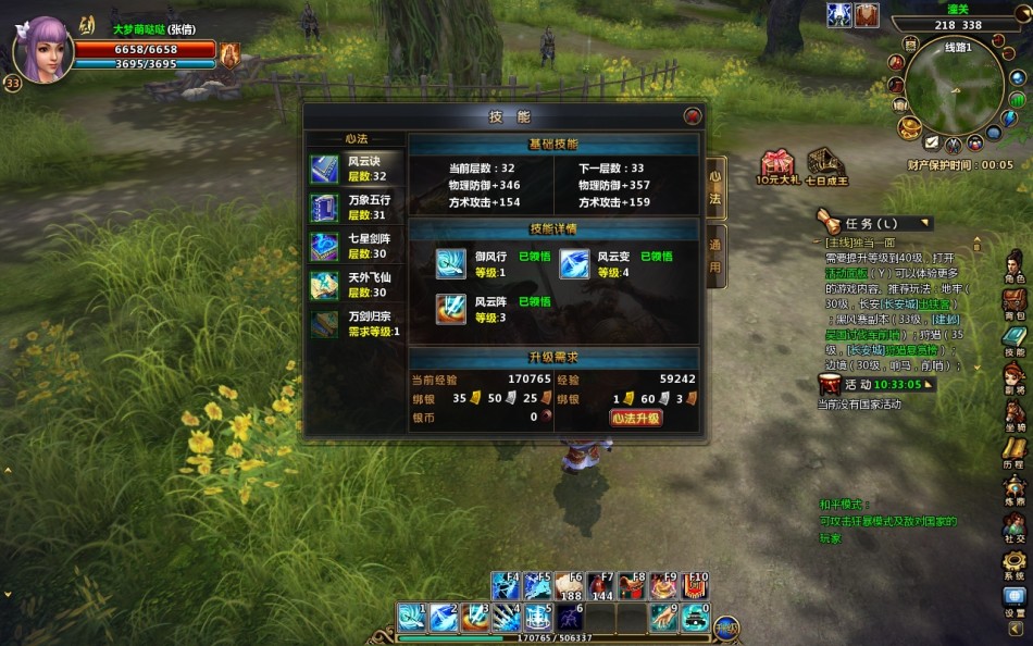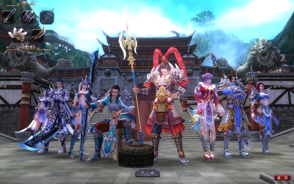游戏中根据武器分为戟、刀、剑、枪和舞这五个职业,职业定位明确。而职业的技能升级方式学习了回合制中的设定,玩家必须用人物经验和金钱来升级心法,心法到一定等级可以激活其中的技能。前期为了保证玩家的升级速度,所以是自动升级的设定,所以很容易任务完成后升级使得技能升级所需经验不足,之后30级开启手动升级后就可以根据等级提升心法。