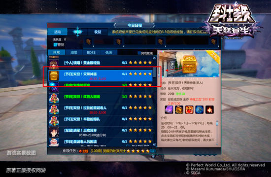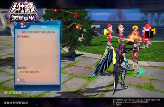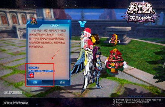 绽放烟花 期待美好2015《圣斗士星矢》本次双旦狂欢包含十大精彩活动,带给你更多的欢笑和更高额的回报。2014年恰逢完美世界十周年,在12月23日活动开启后,身处圣域神职区的NPC魔铃将与《圣斗士星矢》的玩家们共同见证这一时刻。完成任务可获得大量经验或历练、神魔之血、白银之血、龙之鳞,更可获得极具纪念价值的绝版称号“十年完美·青春绽放”。同时,天降宝箱再度升级出新,在12月23日至12月29日每天20:00-21:00,20级以上的圣斗士每隔10分钟屏幕上会出现神器宝盒,点击后必中神器精华1个,并附带诸如绝版神器、经验或历练、神魔之血、黄金圣衣碎片、黄金之血、灵力之源100个、灵力之源100个等精彩好礼。集齐9个神器精华,即可兑换1个神器之徽,两个神器之徽可兑换绝版神器1个!