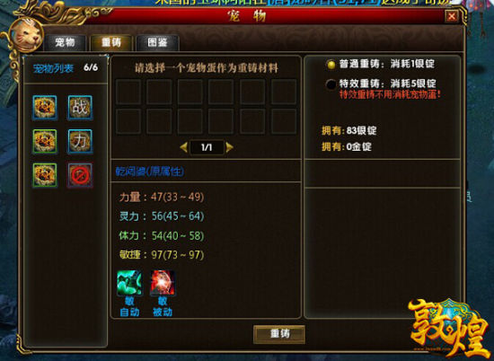 在《敦煌》中,能够变异的仙宠只有通过重铸才能触发变异。重铸宠物的话不仅能够触发变异,还可以大大提升宠物的各项属性哦!一举两得!