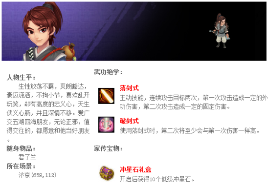 动漫武侠回合制网游《盖世豪侠》的汴京城里住着一位名闻遐迩的英雄人物——令狐公子,他喜欢开玩笑,又非常重感情,如果与他结识,是一件非常幸运的事情,他有可能会送各位他的随身物品。如果你们的友好度达到至交,还将获得令狐公子送出的家传宝物一个,是不是很有意思?