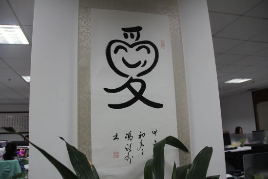 走进雪狼游戏,首先映入眼帘的是一个艺术化的“爱”字,两侧还各有光明、喜悦两个词,这也是《仙途2》“爱·光明·喜悦”的游戏核心理念。四周的墙上也挂着各种不同的书法作品,据介绍都是知名书法家撰写。