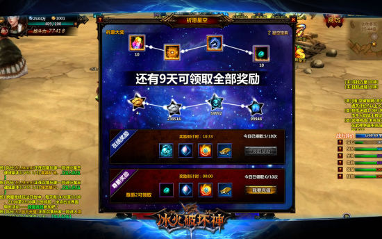 作为独立的个体,每个人都可以有愿望。愿望并不单一,而且会随着个体的意志迥然不同。当向星空虔诚祈愿,就可以得到实在的奖励,在游戏中切实可以使用。越是虔诚地连续祈愿,能够得到的物品会越来越珍贵。而每次随着在线的时间延长,就能得到可观的奖励,当在游戏中拥有尊爵的身份,将会有额外的奖励领取。