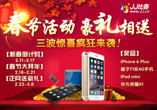 春节回家玩什么?寂寞的时候玩什么?当然是玩春节期间“不放假”的JJ比赛。据悉,JJ比赛将在2.11—3.8期间举办“羊年大吉”春节活动,用精彩纷呈的上千场比赛和诸如iPhone 6-Plus、iPhone 6、iPad mini、华为平板电脑等价值千万的豪礼陪伴广大玩家过春节。